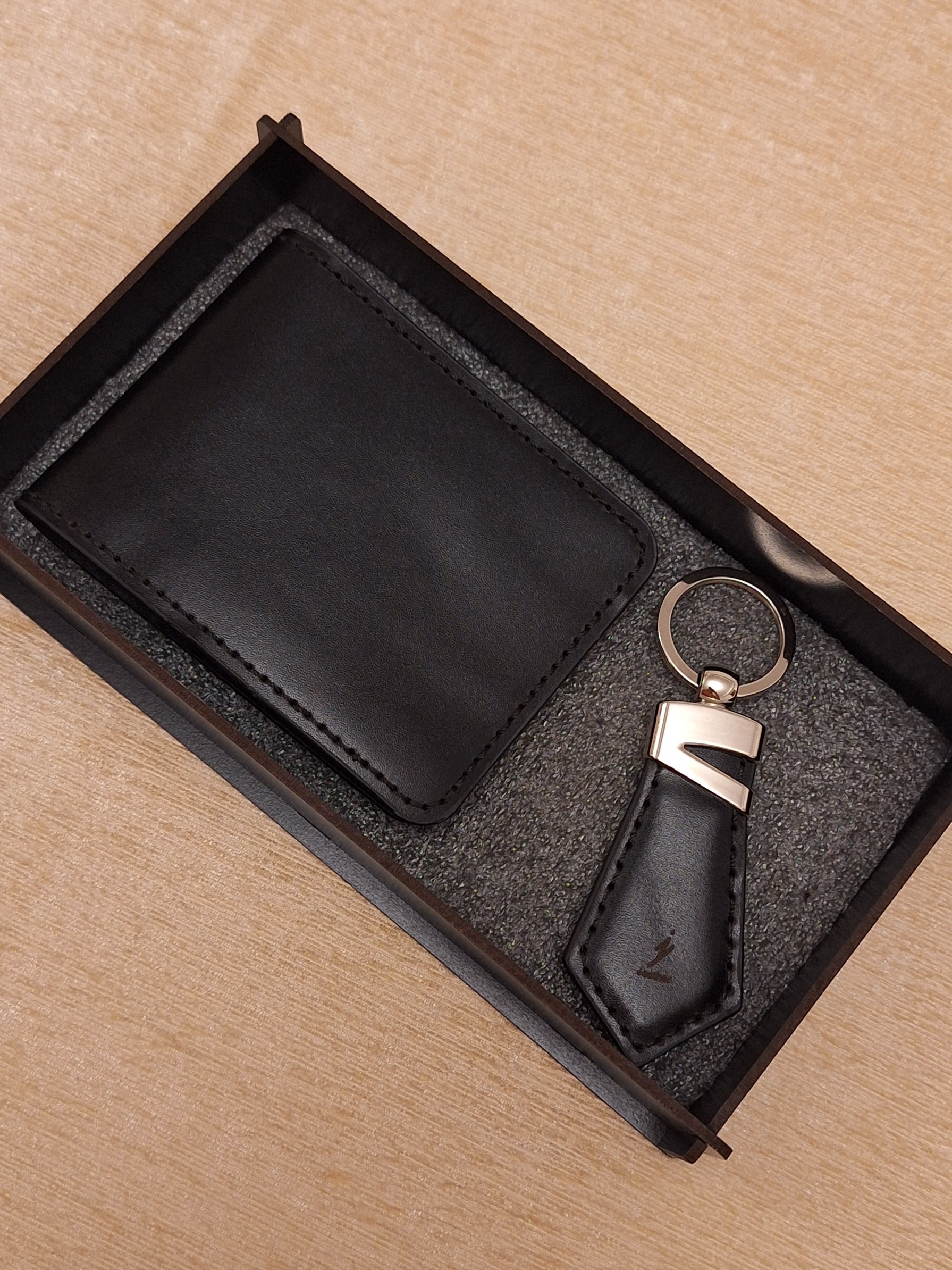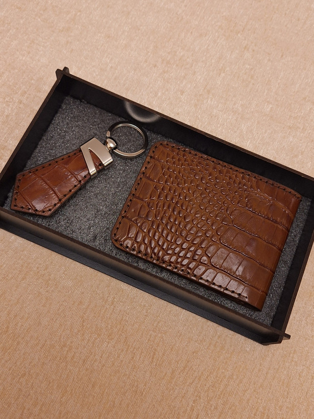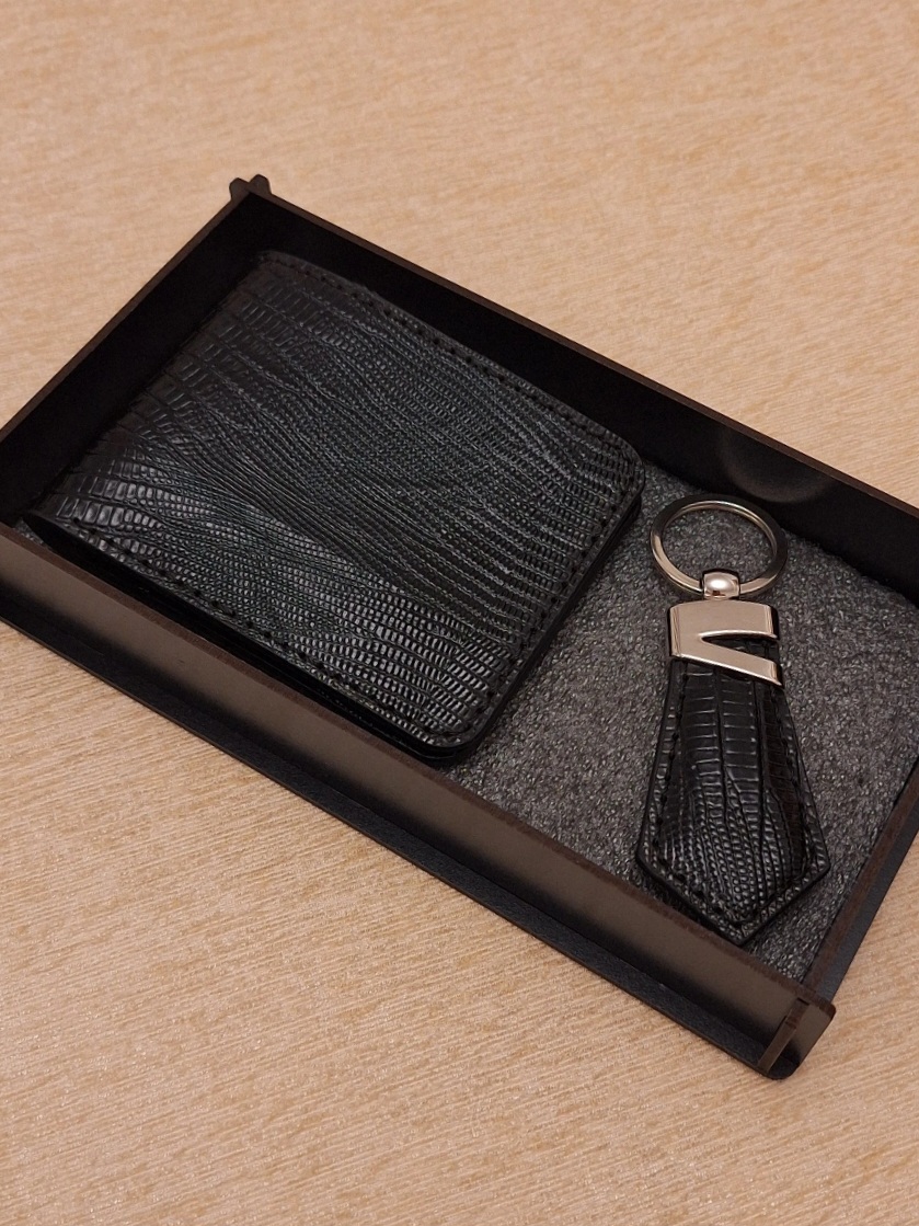 ست کیف پول جیبی و جاکلیدی کراواتی با باکس چوبی