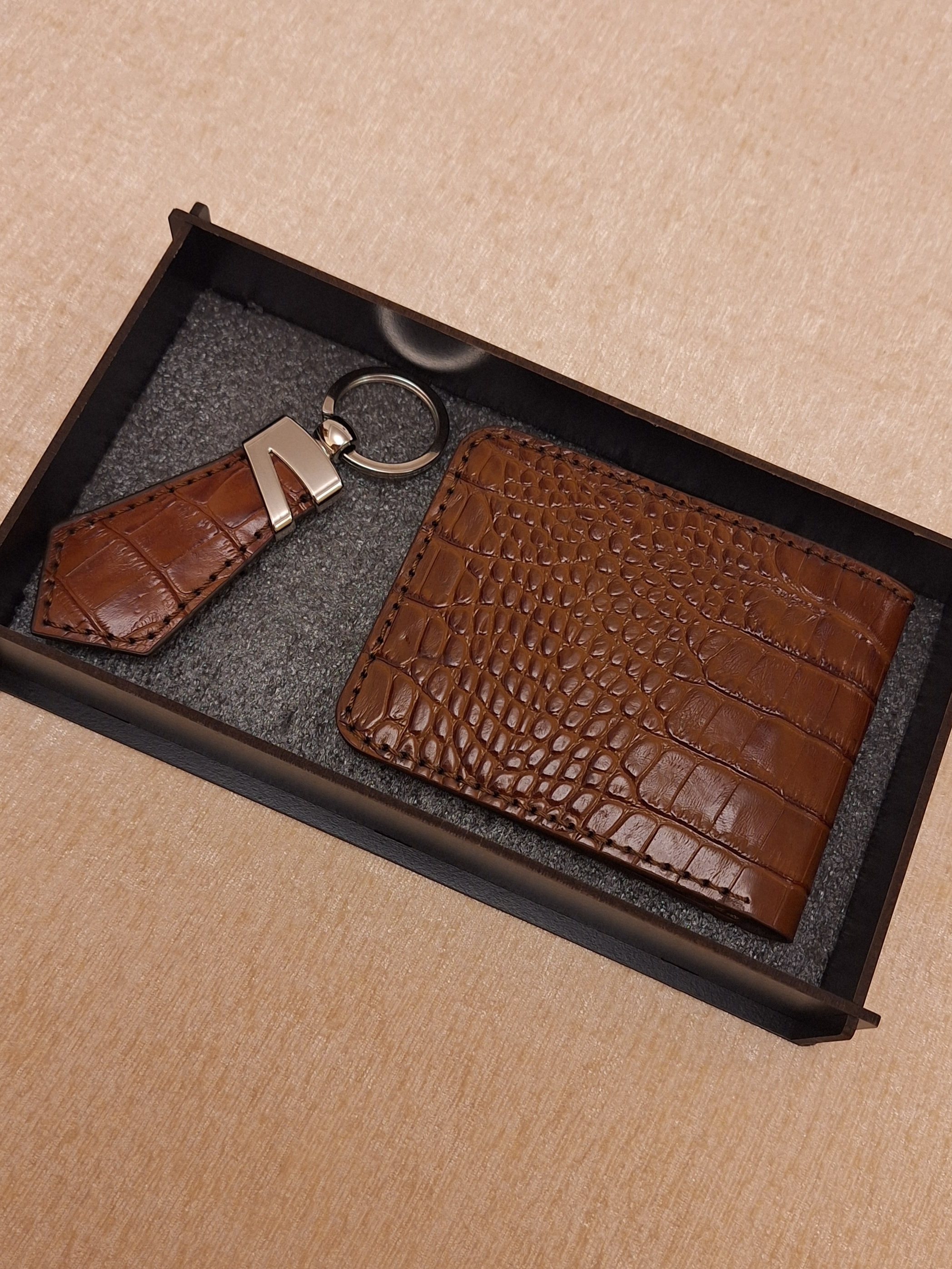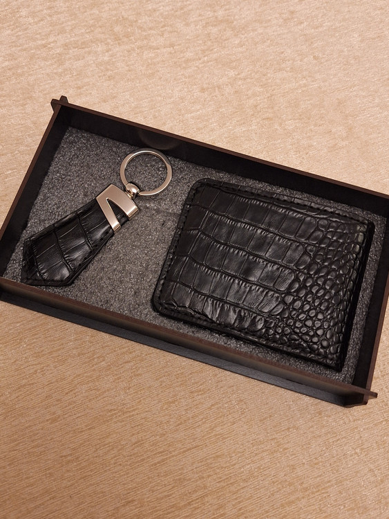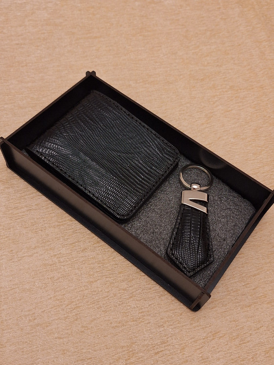 ست کیف پول جیبی و جاکلیدی کراواتی با باکس چوبی