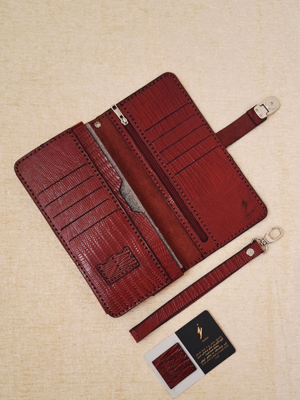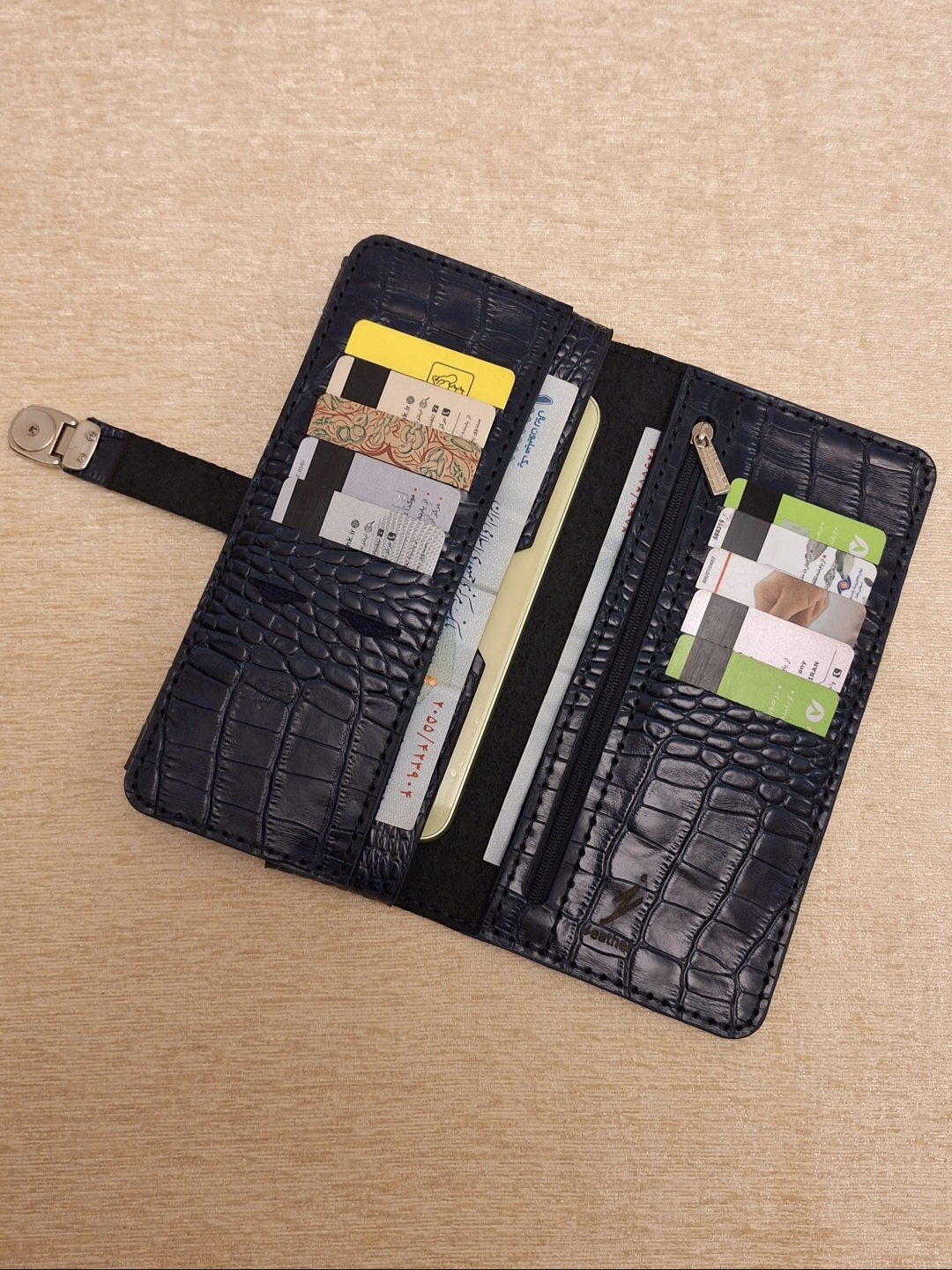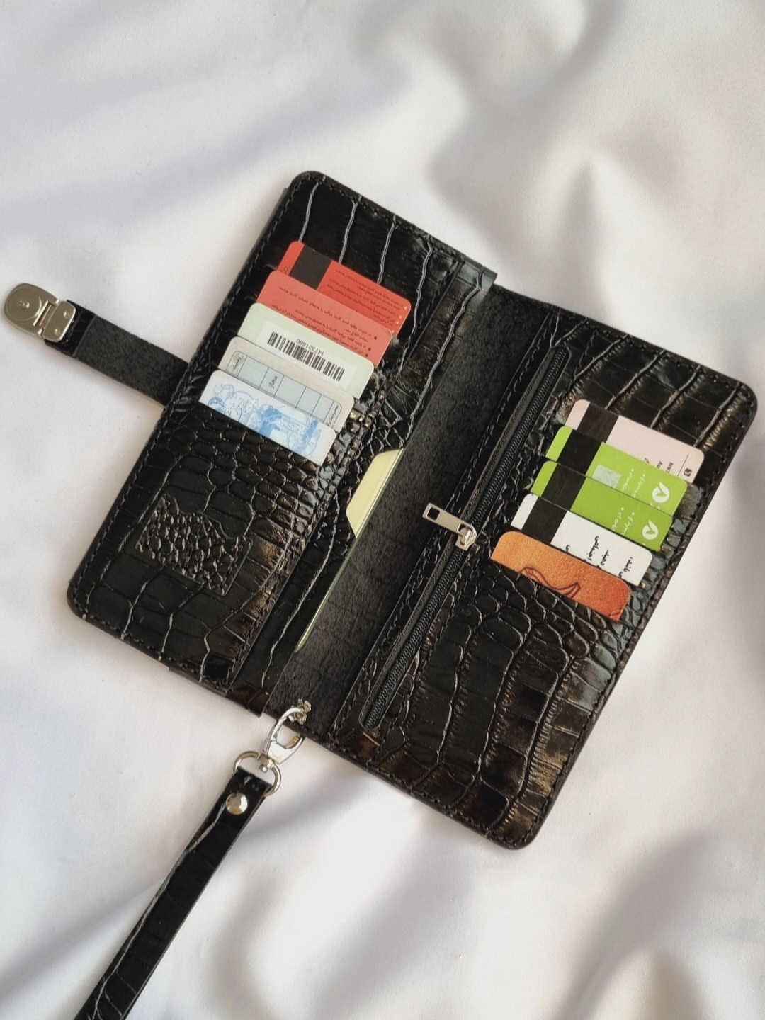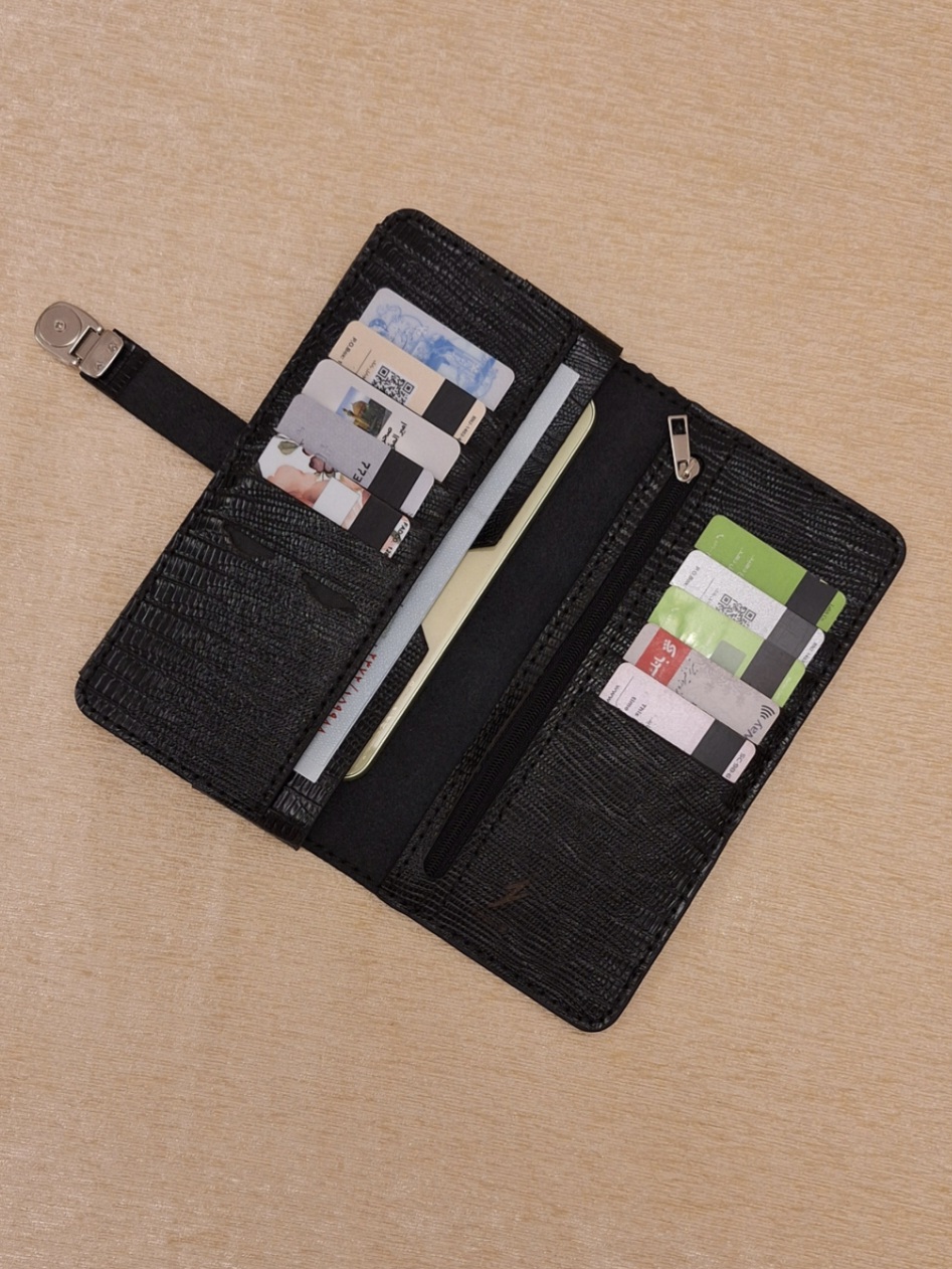 کیف پول دارای جیب موبایل/ ۸ یا ۱۰ جیب کارت/ یک جیب زیپ دار/ یک یا دو جیب اسکناس