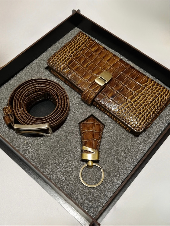 ست کیف پول کتی (کیف موبایل)/ جاکلیدی کراواتی/ کمربند مردانه با باکس چوبی