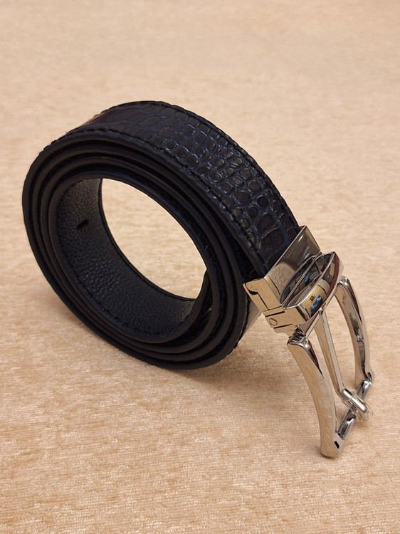 کمربند مردانه دورویه/ سه لایه چرم گاوی اعلای تبریز/ دستدوز/ با سگک چرخشی/ هر دو طرف چرم گاوی (یک طرف سرمه ای کوروکو و یک طرف سرمه ای مرسدس)