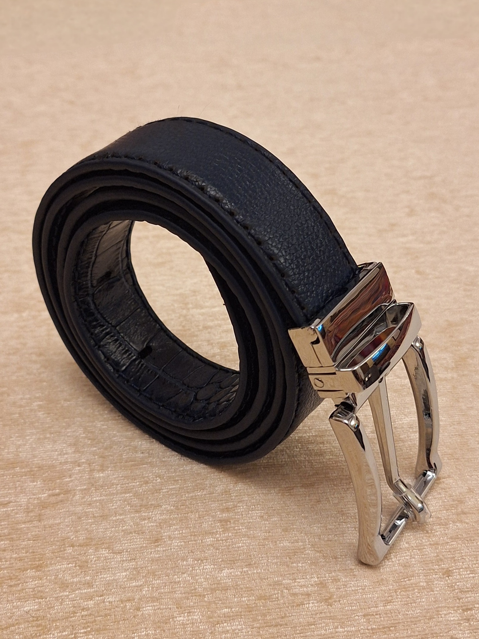 کمربند مردانه دورویه/ سه لایه چرم گاوی اعلای تبریز/ دستدوز/ با سگک چرخشی/ هر دو طرف چرم گاوی (یک طرف سرمه ای کوروکو و یک طرف سرمه ای مرسدس)