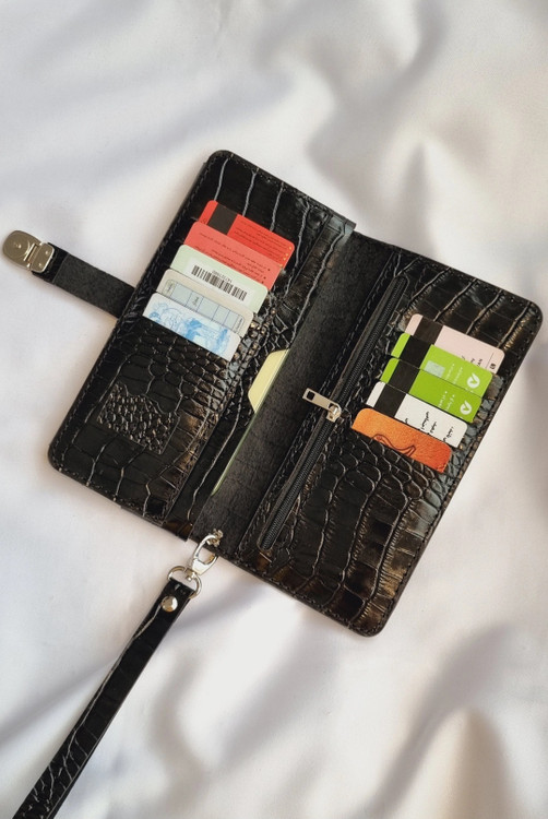 کیف پول دارای جیب موبایل، ۱۰ جیب کارت، دو جیب اسکنلس، یک جیب زیپ دار و دو جیب سیم کارت