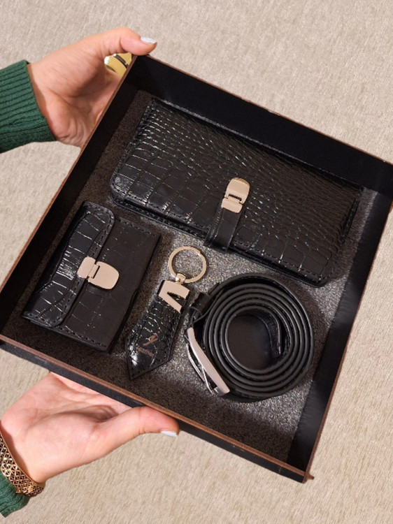 ست کیف پول و موبایل، جاکارتی آکاردئونی و جاکلیدی کراواتی و کمربند مردانه با باکس چوبی