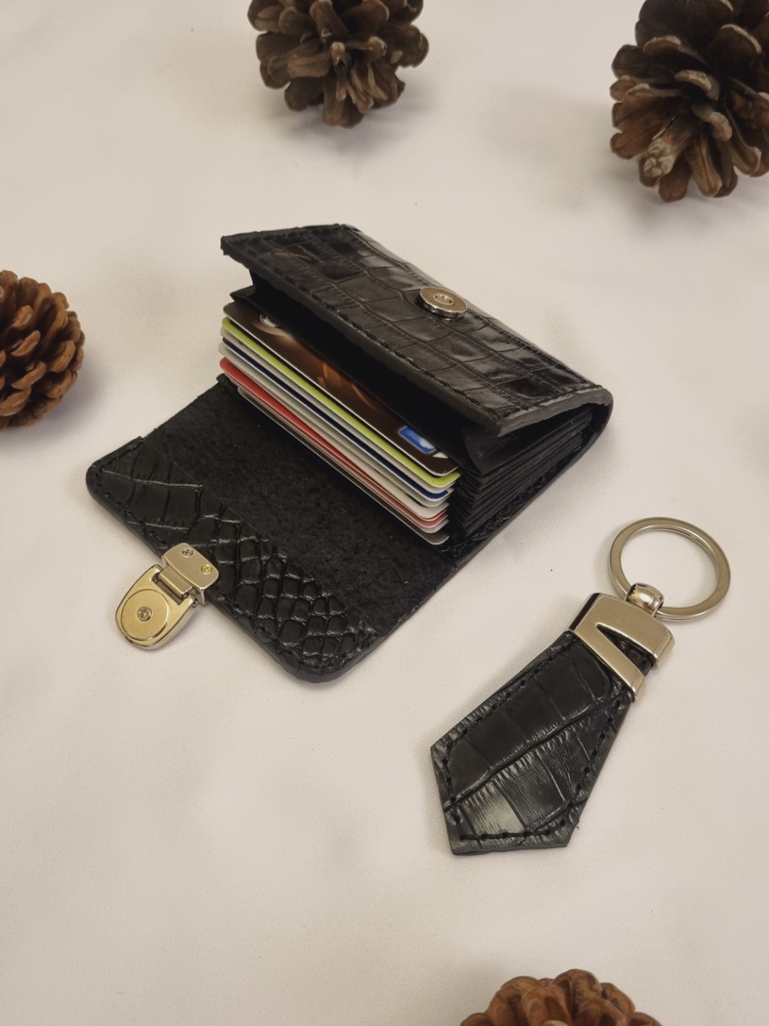 ست کیف پول و موبایل، جاکارتی آکاردئونی و جاکلیدی کراواتی و کمربند مردانه با باکس چوبی